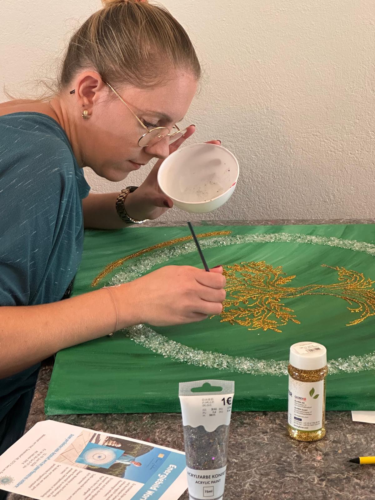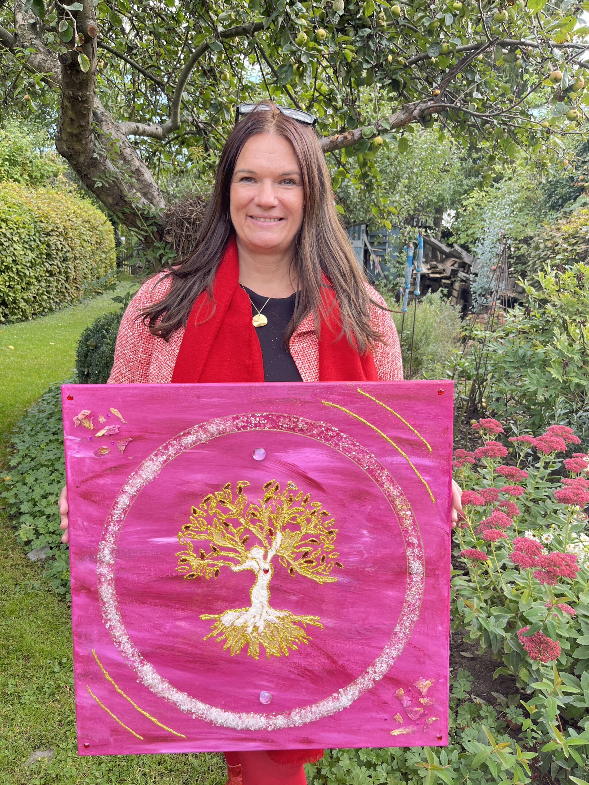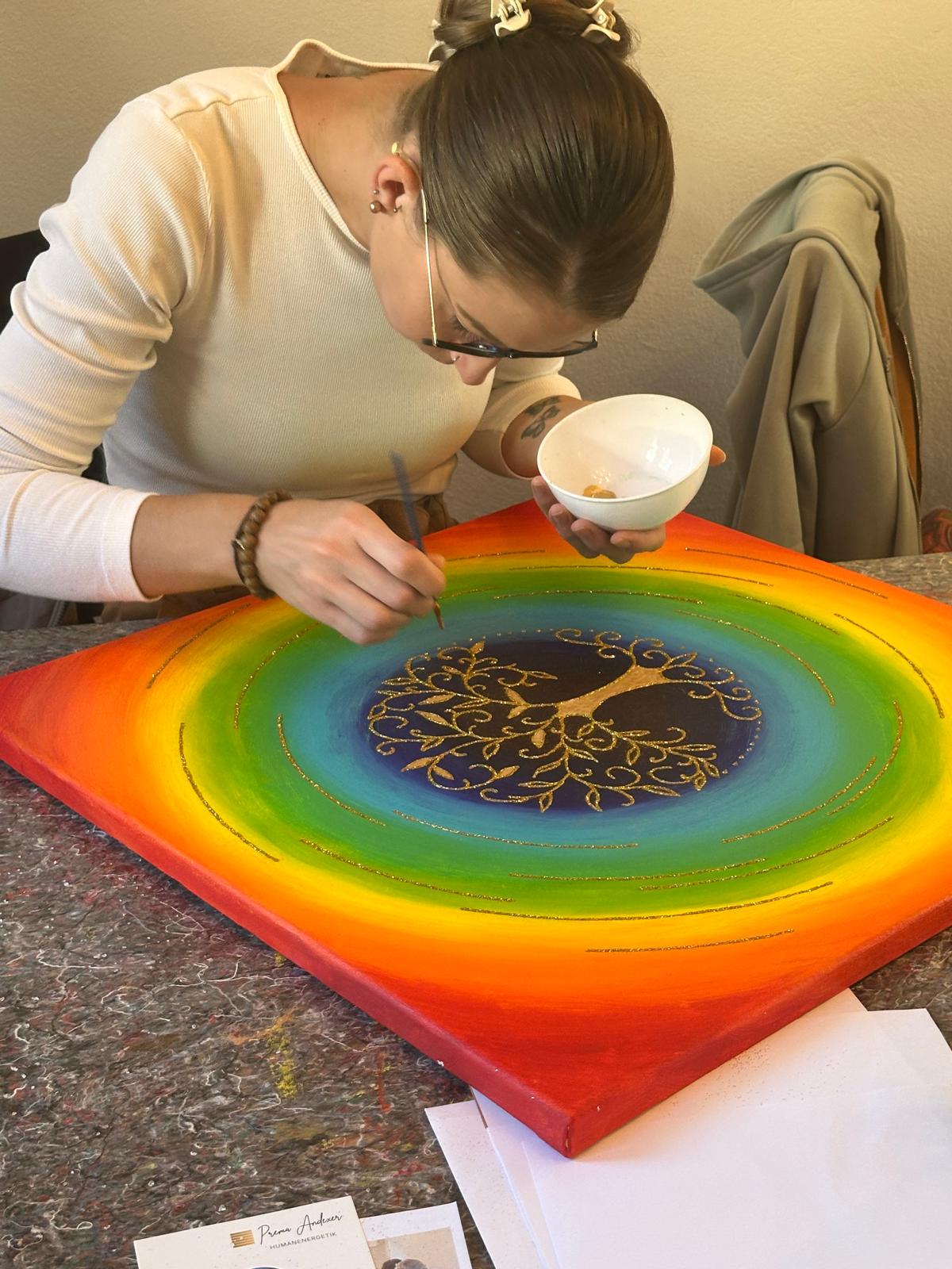 Dein Baum als kraftvolles, magisches und heilsames Symbol entsteht auf einer 60x60cm großen Leinwand. Es wird mit Acryfarben, Steinen, Glitter und Strukturmaterialien gearbeitet.